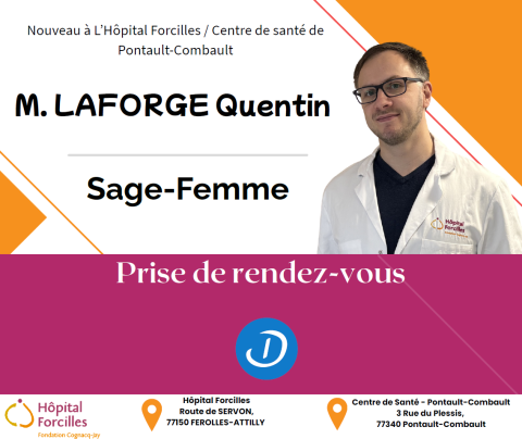 Vous pouvez désormais consulter M. Quentin Laforge, sage-femme. Il consulte au centre de santé les lundis, mardis et mercredis.