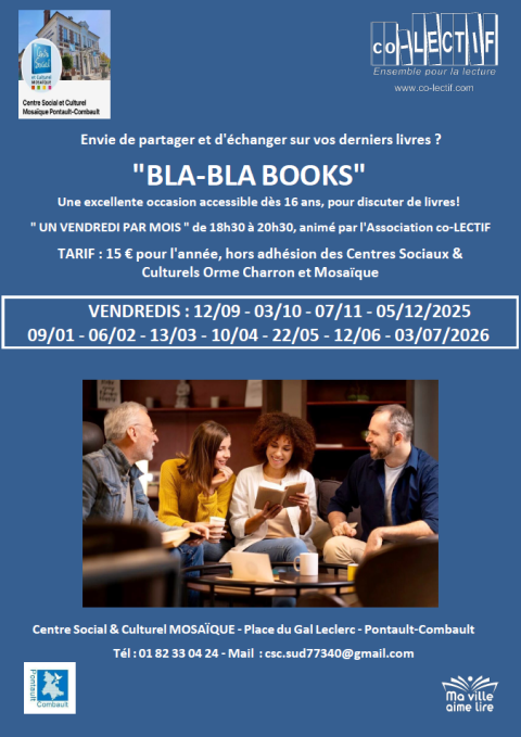 - Centre Social et Culturel Mosaïque, place du Général Leclerc / 01 82 33 04 24 / csc.sud77340@gmail.com