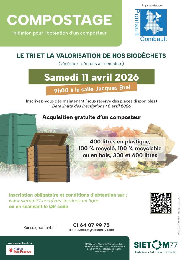 La Municipalité, en partenariat avec le SIETOM 77, organise une nouvelle distribution de composteurs, samedi 11 avril, découpée en 2 sessions au choix : La distribution se déroulera à la salle Jacques-Brel dès 9h.