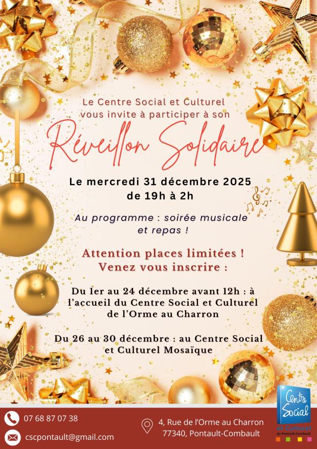 Le centre social et culturel vous convie à leur réveillon solidaire le mercredi 31 décembre ! Inscrivez-vous dès à présent.