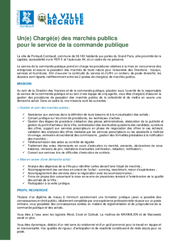 Vous pouvez envoyer votre candidature spontanée par mail à : recrutement@pontault-combault.fr