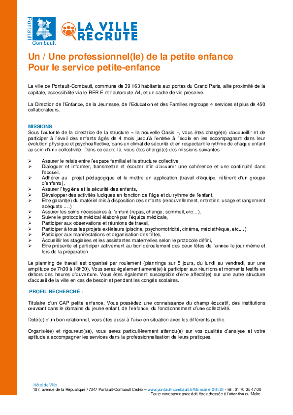 Vous pouvez répondre à une offre par mail à : recrutement@pontault-combault.fr