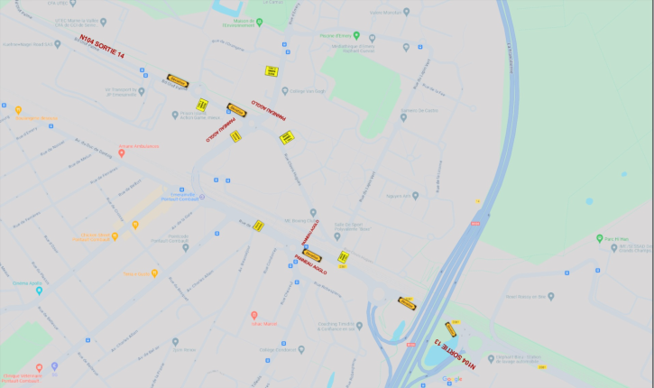 Une déviation sera mise en place par la N104 par l’entreprise en charge des travaux (voir plan ci-joint).