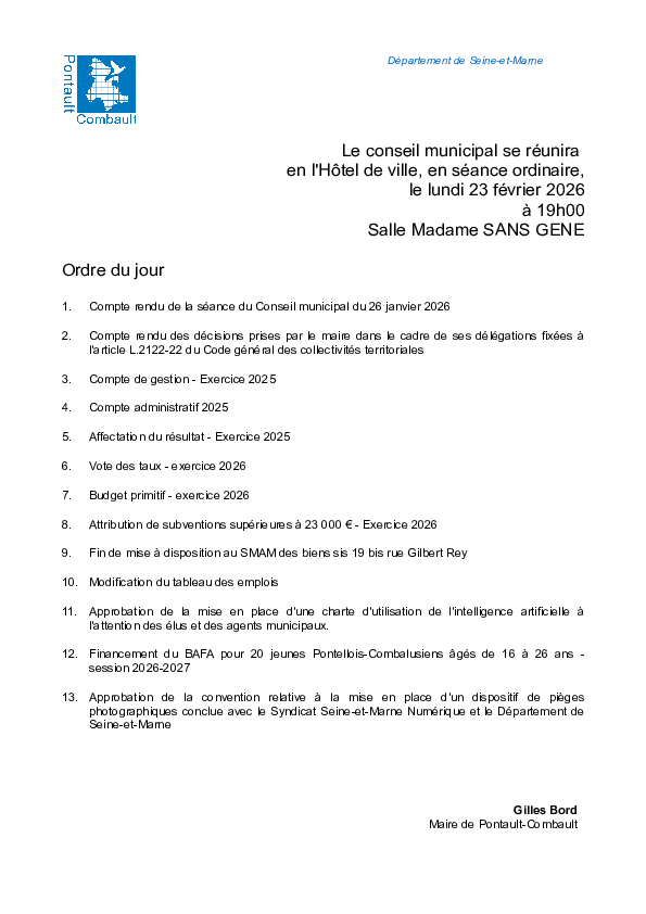 PROCHAINES SÉANCES DU CONSEIL MUNICIPAL : LUNDI 23 FÉVRIER